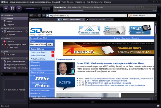 Изначально проигрыватель с открытым кодом Songbird позиционировался как альтернатива iTunes (в программе даже предусмотрен импорт/экспорт файлов в iTunes), однако время показало: этот плеер настолько индивидуален, что конкурировать с продукцией Apple ему просто незачем. У Songbird есть интересная концепция, удобный интерфейс. Еще бы к этому удачную реализацию, но, увы, — тут не все так гладко, как хотелось бы. От идеи до победы очень далеко. Программа имеет некоторое количество ошибок, которые касаются, главным образом, воспроизведения видео. Да и функциональность браузера непривычно урезана до самых-самых важных опций. Для пользователя, который должен, по мнению создателей Songbird, полностью или частично «спрыгнуть» с Opera, Chrome или Safari, отказ от удобств, к которым он годами привыкал, будет, скорее всего, просто невозможен. Впрочем, тех, кто постоянно держит в кармане MP3-плеер, это не должно отпугнуть. Ведь что такое нехватка функций в браузере по сравнению с удовольствием от музыки, которая будет всегда под рукой!