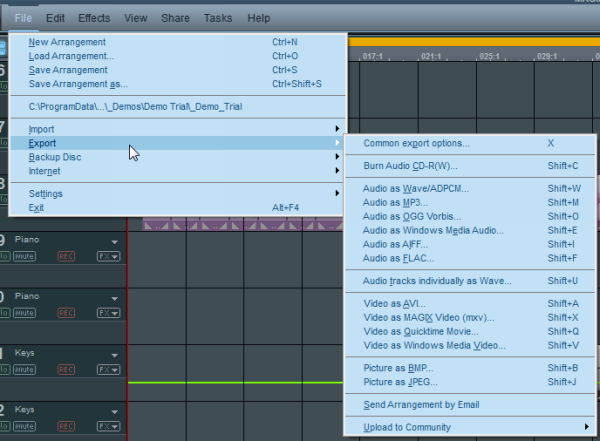 Готовые проекты могут быть экспортированы в файлы MP3, WAV, OGG, WMA, AIFF, FLAC. Также предусмотрена запись на CD прямо из программы и возможности публикации на SoundCloud, Facebook✴, Twitter и YouTube.
