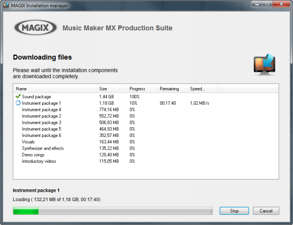 Подобная процедура имеется и в других программах от MAGIX. В принципе, это необязательный шаг, и при желании его можно пропустить. Однако мы рекомендуем (особенно на первых порах) позволить музыкальному редактору установить все, что только можно, — наглядные примеры песен и библиотеки инструментов позволят быстрее изучить приложение, что особенно важно на первых этапах освоения ремесла музыканта. Процесс загрузки займет немало времени, ведь вначале менеджер загрузок от MAGIX скачает с сервера нужные файлы, а затем их необходимо будет установить. Если учесть, что размер библиотек исчисляется сотнями и сотнями мегабайт, времени на это уйдет довольно много.