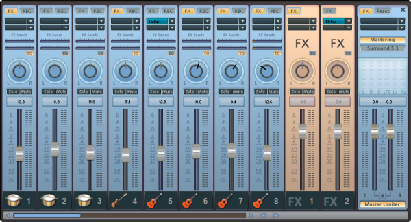 Всего в программе можно использовать до 96 независимых дорожек в расширенной редакции и до 64 — в стандартной. На наш взгляд, даже очень-очень сложный проект вряд ли сможет полностью занять все треки виртуальной студии. Если одновременно будут звучать десятки разных инструментов, то это уже будет не музыка, а сплошной хаос.
