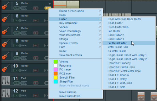 К каждому семплу, помещенному в окно проекта, можно применить уникальный эффект. Набор эффектов в MAGIX Music Maker MX свой для каждого инструмента. Эффект выбирается непосредственно на рабочей области. Можно также применять эффекты ко всему треку.