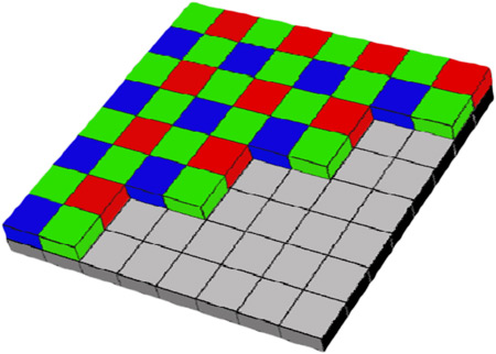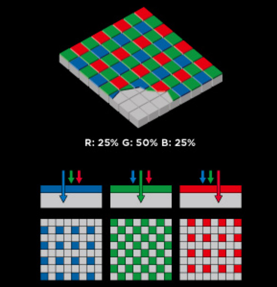 Порядок расположения фотодиодов, фиксирующих тот или иной цвет, в большинстве случаев подчиняется алгоритму под названием фильтр Байера. Это наиболее популярный вариант расположения фотоэлементов, при котором используются три цветовые составляющие: красный, синий и зеленый. Они располагаются таким образом, что образуется квадрат с двумя зелеными датчиками и по одному — красного и синего цветов.