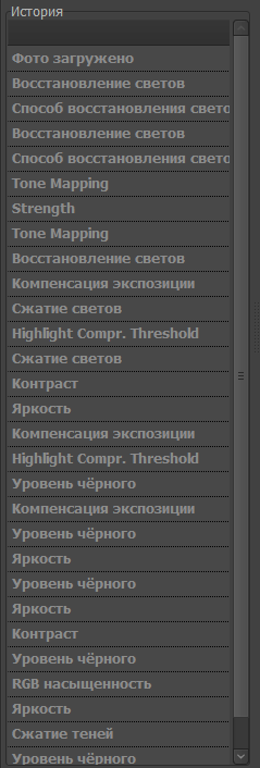 RAW Therapee хранит историю выполненных действий точно так же, как это реализовано в Adobe Photoshop. В любой момент можно откатиться к предыдущему этапу обработки изображения.