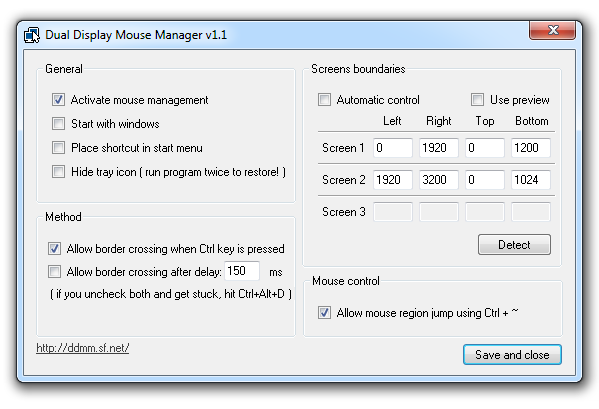 Создатель бесплатной утилиты Dual Display Mouse Manager придумал сразу два оригинальных способа решения этой проблемы. Первый вариант состоит в том, что при запуске Dual Display Mouse Manager курсор движется по экрану неравномерно, с задержкой на границе, отделяющей область первого рабочего стола от второго. В результате попадать курсором по нужной кнопке или в нужную область на границе двух мониторов становится гораздо проще.