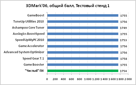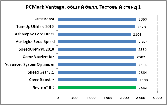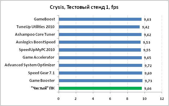 Тестирование производилось следующим образом: устанавливался один из перечисленных выше оптимизаторов и в нем активировался режим ускорения, после этого запускались бенчмарки с играми, и затем операционная система Windows 7 возвращалась к исходному состоянию посредством инструмента Comodo Time Machine. В результате многократного повторения данного процесса нам удалось собрать сведения о производительности компьютеров, которые мы для наглядности представили в виде гистограмм.