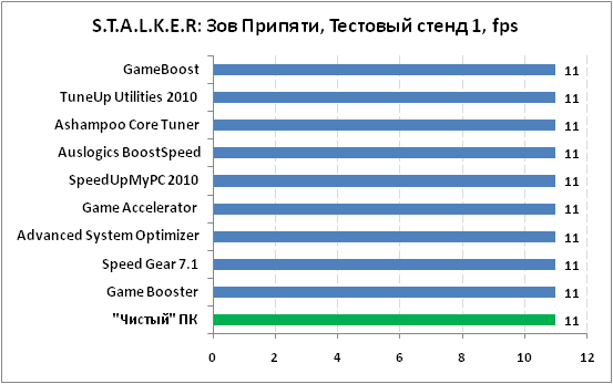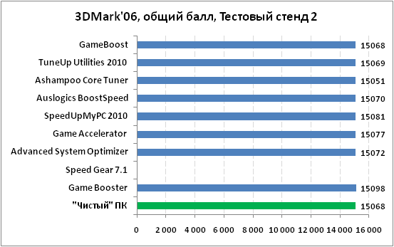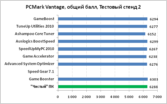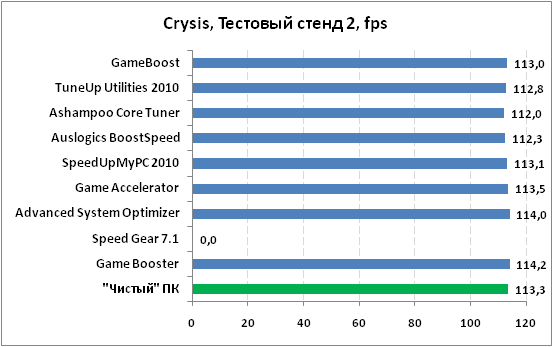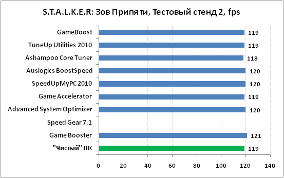 Помимо не участвовавшего в тестах Game Turbo Booster, успел отличиться и Speed Gear 7.1, тот самый, который доверху напичкан хитроумными технологиями Duo Speeder Engine, Time Redemption, Linearity Accelerate. Данный инструмент так хорошо оптимизировал первый тестовый компьютер, что от нахлынувшей "мощи" собирающий статистическую информацию модуль игры "S.T.A.L.K.E.R.: Зов Припяти" просто-напросто зависал, не позволяя нам извлечь сведения о частоте кадров в программе. На второй тестовой платформе после вмешательства Speed Gear 7.1 в настройки компьютера и вовсе не запустился ни один бенчмарк. Владельцам 64-разрядных систем следует взять на заметку этот факт и при случае обходить стороной данную программную поделку.