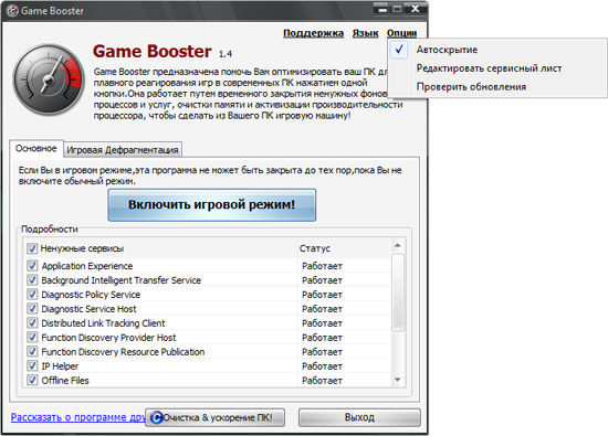 Единственный ускоритель в нашем обзоре, распространяемый компанией-разработчиком IObit на безвозмездной основе. Судя по представленному на сайте описанию и элементам интерфейса (кстати, многоязычного и переведенного на русский), потенциал Game Booster довольно скромен и ограничивается только приостановкой ряда системных процессов и служб, а также дефрагментацией файлов игровых приложений. Список выгружаемых из оперативной памяти модулей Windows можно варьировать, помечая галочками соответствующие пункты. Оптимизация хранящихся на диске данных производится в том же духе. Правда, какую бы мы директорию мы ни выбирали, утилита без раздумий всякий раз выдавала фразу: "Фрагментированные файлы отсутствуют". Подобное поведение Game Booster не может не настораживать и лишний раз подчеркивает, что фигурирующая в интерфейсе вкладка "Игровая дефрагментация" носит исключительно косметический характер, но никак не практический.