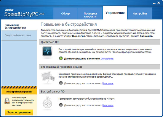 Твикер, предназначенный для ускорения работы компьютера. В активе SpeedUpMyPC 2010 - сканер системных ресурсов, выискивающий требующие оптимизации компоненты Windows, перераспределяющий загрузку процессора диспетчер задач, упреждающий генератор эскизов, модуль быстрого запуска приложений, а также симпатичный интерфейс, переведенный на двенадцать языков, включая русский. При запуске программа автоматически анализирует скоростные характеристики электронно-вычислительной машины и выдает количество обнаруженных недочетов в системе, ликвидация которых, по заверениям разработчиков продукта, позволит добиться существенного прироста производительности ПК. О характере выводимых на чистую воду недоработок утилита скромно умалчивает, настойчиво предлагая пользователю активировать установленную версию SpeedUpMyPC. При этом обещается тридцатидневный Money Back. Оплатить покупку можно посредством системы электронных платежей PayPal или банковскими картами Visa, MasterCard, American Express.