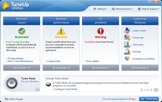 Самая дорогостоящая и увесистая программа в нашем обзоре. По сути, является аналогом SpeedUpMyPC 2010, только более понятным и удобным в использовании. Сродни упомянутому продукту, TuneUp Utilities 2010 производит поиск узких мест в производительности компьютера, но не замалчивает информацию о них, а предоставляет подробные сведения, руководствуясь которыми, владелец ПК может вручную ликвидировать недочеты либо доверить их исправление автоматике. Полезных инструментов в пакете - вагон и маленькая тележка. Чисто геймерским из них является компонент Turbo Mode, переключающий систему в игровой режим одним щелчком мыши. При этом из памяти компьютера выгружаются лишние программы и вычищается прочий цифровой мусор, фоновая обработка которого может нарушить комфортную работу с современными игровыми приложениями, насыщенными графическими и мультимедийными элементами. Нельзя не упомянуть об еще одном важном моменте: TuneUp Utilities 2010 оказалась единственным продуктом, в котором нам удалось обнаружить полноценную справочную документацию. На английском языке, естественно.