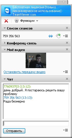 Общение с пользователем, находящимся за удаленным компьютером, можно выполнять с помощью небольшого чата, который позволяет обмениваться мгновенными сообщениями. Также можно вести беседу, используя голосовую связь по IP-протоколу. Если к компьютеру подключена веб-камера, то с помощью TeamViewer можно организовывать и сеанс видео-чата.