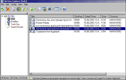 В процессе работы с компьютером мы настолько часто используем сочетание "горячих" клавиш, что просто не обращаем на это внимание. Одни из самых используемых сочетаний - ctrl+c (копирование) и ctrl+v (вставка). Первая операция копирует выделенный текст или рисунок в буфер обмена, вторая - вызывает содержимое буфера обмена. Казалось бы, все проще простого и ничего нового в процессе copy-paste изобрести нельзя. И все же… Разработчики компании Thornsoft постарались по-новому подойти к идее буфера обмена, в результате чего ими была создана программа под названием ClipMate.