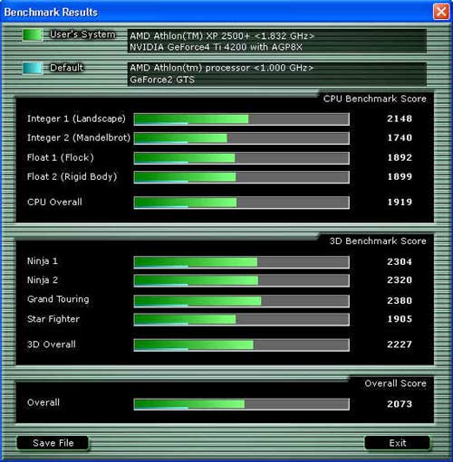 В тесте процессора подсчет производительности определяется скоростью целочисленного вычисления / арифметики с плавающей точкой, а в тесте видеоподсистемы - исходя из среднего количества кадров в секунду. Сравнение результатов ведется относительно вышеприведенной конфигурации компьютера (Athlon -1GHz с GeForce2), которая имеет по 1000 очков в каждом тесте.