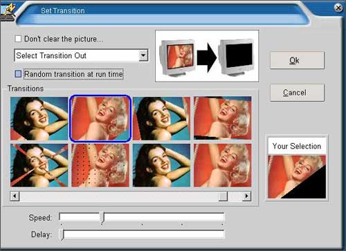 Вы сможете выбрать Transition Effect, с которым картинка будет появляться на экране, и тот, с которым она будет исчезать. Также можно указать скорость перехода и время, в течение которого каждое изображение будет находиться на экране.