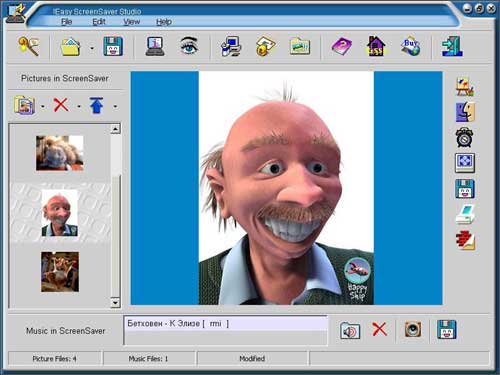 Интерфейс Easy ScreenSaver Studio очень продуман, все необходимые опции вынесены на рабочее пространство, и долго думать, как добавить картинку или убрать аудиофайл, вам не придется. В нижней строке окна программы отображается статистика. Взглянув туда, можно узнать, сколько графических и музыкальных файлов задействовано в проекте.