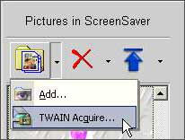 Если вы собираетесь делать скринсейвер из фотографий, которые не успели отсканировать, можете сделать это прямо в программе. Для этого в ниспадающем меню добавления изображений в проект выберите строку TWAIN Aquire.