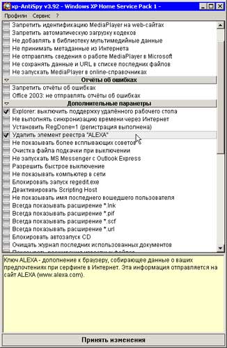 К ним относятся отключение модуля "ALEXA", отключение поддержки yдaлённoгo paбoчeгo cтoлa в Explorer, отключение службы сообщений, запрет на aвтoмaтичecкoe oбнoвлeниe Internet Explorer. При наведении курсора мыши на ту или иную настройку в окне XP-AntiSpy, в нижней части окна программы отображается краткое описание выбранного параметра.