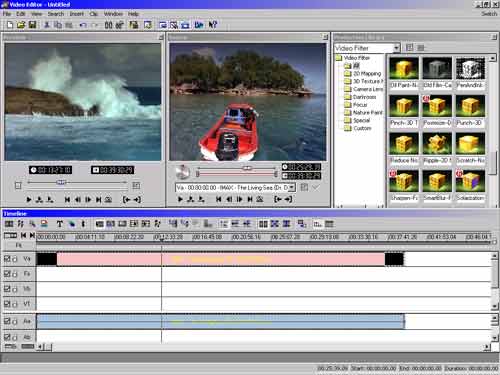 В разделе Audio Filter, хранятся фильтры, обеспечивающие наложение звуковых эффектов на аудиодорожку, а в Video Filter - соответственно, видеофильтры (искусственные блики, эффект рыбьего глаза, смазывание изображения, мозаика и пр.). Все вышеописанные эффекты легко добавить к определенному клипу, перетащив на него соответствующую иконку из Production Library.