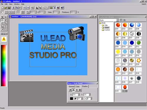 Несмотря на то, что наложить титры можно и в Video Editor, в UMS Pro имеется специальная программа для наложения текста на видео. В CG Infinity можно не только задать свой стиль шрифта и траекторию движения титров, но и вставить в будущий фильм некоторую графику в формате Windows Metafile (*.WMF) и Enhanced Windows Metafile (*.EMF). Интерфейс CG Infinity напоминает Video Paint'овский, однако внизу отсутствует линейка времени. Программа располагает следующими библиотеками: Object ("Объекты"), Style ("Стиль"), Moving Path ("Траектория движения") и Envelope ("Кривая"). Чтобы наложить какой-нибудь объект из библиотеки на кадр, нужно переместить его точно так же, как это делается в Video Paint.