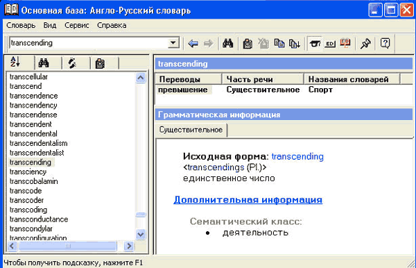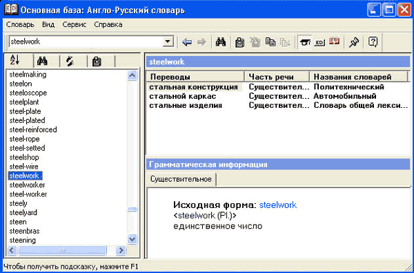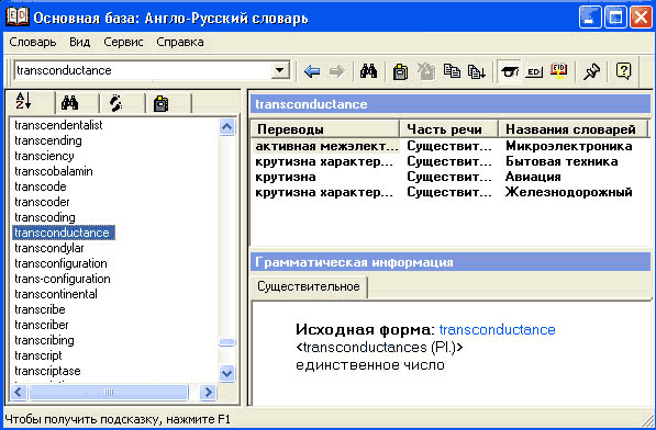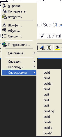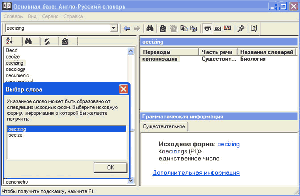 В ходе тестирования была выявлена еще одна полезная особенность словаря. Если искомое слово может быть образовано от различных исходных форм, то словарь любезно предоставляет выбор относительно всех этих форм.