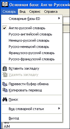 Что еще может программа? Пока не будем касаться ее словарных возможностей, пока только об интерфейсе. Ну, естественно, имеется возможность быстрого переключения между направлениями перевода, осуществляемое через пункт "Словарь" основного меню. С помощью него же можно вставить или удалить закладку для осуществления быстрого последующего поиска слова или просто найти какое-нибудь слово во всех словосочетаниях имеющихся в словарях.