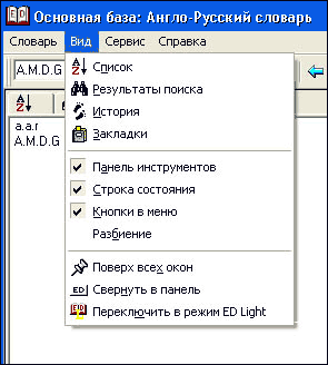 Второй пункт меню "Вид" позволяет настроить интерфейс словаря. Например, левая панель со списком слов может отображаться не только в виде этого самого списка, но и как панель, отображающая результаты поиска слов в базе, как панель просмотра истории ранее переведенных слов и, наконец, как панель, отображаемая слова, помеченные закладками. Я бы сказал, что интерфейс очень функционален, если так можно выразиться. Чувствуется, что каждая галочка здесь несет какую-то важную функцию.