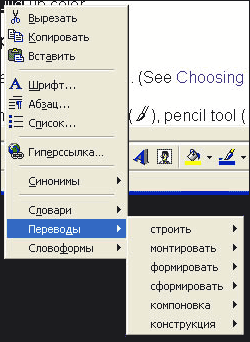 Ну, а теперь пара слов о том, как я это делал. А очень просто! После подключения в словаре соответствующей примочки перевода слов для Wordа, стоит только нажать на правую кнопку мыши на нужном слове, как откроется меню, где помимо стандартных word-овских пунктов, в нижней его части появятся еще три пункта, касающиеся перевода слова.