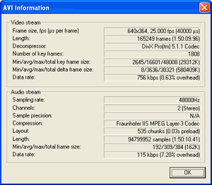 Смотрим далее: ![]() "File Information" - здесь вы можете посмотреть информацию об открытом видео: ![]() "Save striped AVI", "Save stripe master" - это довольно интересная функция, но на данный момент она не очень то пригодится. Смысл её сводится к тому, что при записи, видео будет разбито на несколько потоков и будет записываться в разные файлы. Это напоминает работу RAID массивов. Файлы с расширением .stripe создаются в ручную, и в них прописывается, куда и как будет производиться запись. Для тех, кто захочет разобраться подробно, как работает эта функция, я рекомендую взять Help (VirtualDub_help.rar) от первых версий VirtualDub и почитать его. "Save image sequence" - вот, вот та функция, которой я люблю пользоваться для определения, на сколько ухудшилось качество видео (или для сравнения разных кодеков). При использовании этой функции, кадры вашего видео будут преобразованы в картинки и записаны в файлы. Потом, мы сможем подробно рассмотреть каждый кадр. ![]() Рассмотрю поподробнее это окошко: "Filename prefix:" - какое-либо имя или символ, который будет добавлен перед названием файлов (точнее говоря их номерами). "Filename suffix, include extension:" - окончание имени файла (добавляется после порядкового номера). "Minimum number of digits in name:" - количество цифр в порядковом номере. Если поставить 4, то отсчёт начнётся с 0001, 0002… 9999 и после того, как порядковый номер уйдёт за пределы 4 цифр, буде добавлена ещё одна цифра - 10000, 10001… "Directory to hold images" - здесь указывается директория, в которую будет производиться запись графических файлов. Для того, что бы выбрать эту директорию, нужно нажать на кнопку "…" в конце этого поля (или же, можно написать в ручную, если вам это больше нравится). "First frame filename" и "Last frame filename" - показывают, куда и с какими именами будут сохранены первый и последние файлы картинок. "Output format" - выставляется графический формат, в котором будет производиться запись. Я предпочитаю BMP (формат без сжатия), что вы выставите - большого значения не имеет. "Don`t run this job now; add it to job control so I can run it in batch mode" - пока я только обещаю рассказать, что даёт отложенная запись, но не рассказываю. Видно не пришёл ещё черёд рассказа, про отложенную запись. Потерпите немного. Если поставить эту галочку, то картинки не начнут записываться сразу, а встанут в очередь отложенных записей. Теперь тонкость при работе с этой функцией. Для того, что бы правильно сохранялись картинки, нужно выставить режим работы "Full processing mode" и поставить формат сжатия (Video->Compressin) - Uncompressed RGB. Только в этом случае на формирование изображений пойдёт правильный поток. Далее, когда будете разглядывать картинки, не забудьте, что Mpeg4 кодеки формируют B-frames, которые хуже соседних кадров по качеству. "Save WAV" - производит запись звуковой дорожки видеофильма в WAV формате. При пользовании этой функцией, нужно учитывать определённые особенности. Запись в WAV формате не производит декомпрессии сжатого звука, а записывает его как он есть внутри видео файла, просто подставляя заголовок WAV. Я использую эту функцию при монтаже видео. Допустим, я свёл несколько фрагментов в один фильм (производя попутно подрезку, стыковку…). Естественно, что бы потом звук совпал с видео, мне нужно его сохранить вместе со всеми этими обрезками. Вот в этом случае я пользуюсь функцией "Save WAV" (звук у всех фрагментов был не сжат и спокойно сохраняется в WAV формате). Далее, произвожу действия с видео и в последнюю очередь свожу звук и видео. Ниже