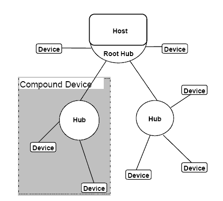 К корневому концентратору могут быть подключены либо устройства, либо еще концентраторы, для увеличения числа доступных портов. Допускается организация до пяти уровней. Концентратор может быть выполнен в виде отдельного устройства, либо быть встроенным в какое-то другое. С этой точки зрения устройства подключаемые к USB можно подразделить на функциональные устройства, т.е. те которые выполняют какую-то конкретную функцию и не берут на себя никаких дополнительных задач (например, мыши) устройства-концентраторы в чистом виде выполняющие только функцию только разветвления, и совмещенные (комбинированные) устройства, т.е. имеющие в своем составе концентратор, расширяющие набор портов и позволяющие подключать другие устройства (в качестве наиболее часто встречающихся примеров можно назвать мониторы, позволяющие по USB осуществлять настройку параметров, и обычно имеющих еще несколько дополнительные порты, для подключения других устройств или клавиатуры, с разъемами для подключения мышей).