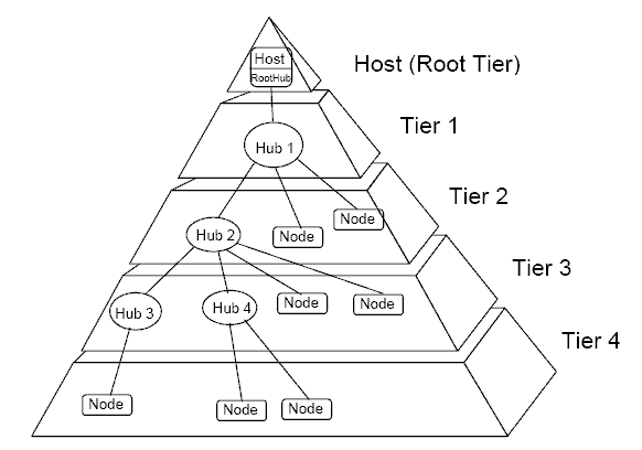 Наверное многие слышали о том что USB шина позволяет подключать до 127 устройств. И в тоже время на задней стенке обычно находится 2 или 4 порта. И у многих наверняка возник вопрос - нас обманули, на нас сэкономили (меньше портов - дешевле система. Хотя… 127 портов разместить на задней панели… Даже представить сложно) или что-то еще. Оказывается дело все в том, что шина USB позволяет многоуровневое каскадирование. Наглядно это объясняет следующий рисунок: