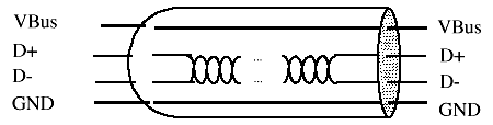 По подписям D+ и D- на схеме кабеля должно быть вы уже догадались, что USB использует дифференциальную передачу (впрочем, каждый порт помимо дифференциального приемника имеет еще и линейные для каждого сигнала), добавлю еще что применяется потенциальное кодирование по методу NRZI (Non Return to Zero Invert to ones, без возвращения к нулю с инверсией для единиц) и битстаффинг для улучшения самосинхронизирующихся свойств потока. Это в общем. Глубже мы не станем вдаваться. Совершенно ни к чему.