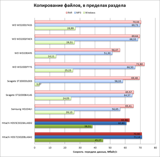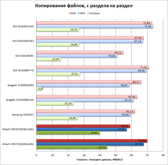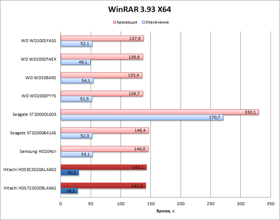 Тест с помощью WinRAR стал звездным часом для дисков Hitachi — благодаря эффективной работе с мелкими файлами им удалось занять первые места по скорости распаковки архива.
