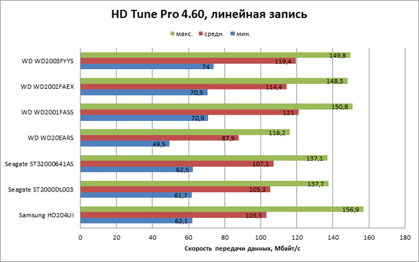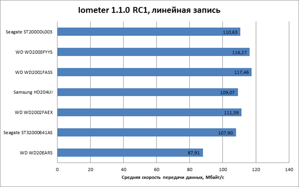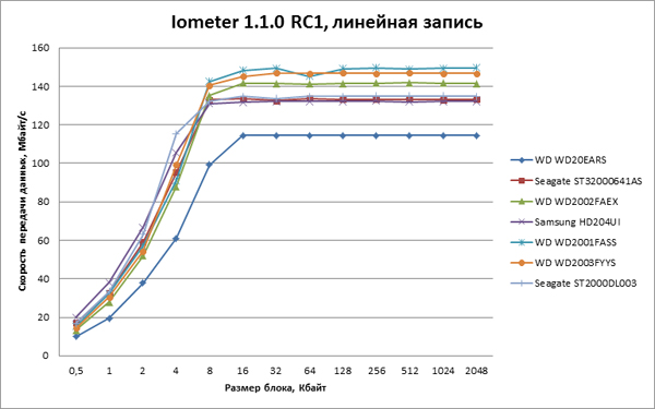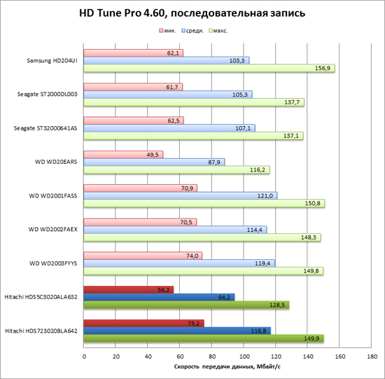 HDS5C3020ALA632 тоже немного отстает от прочих зеленых дисков при чтении, зато оказался лидером в своей категории при записи блоков благодаря «классическим» 512-байтовым секторам.