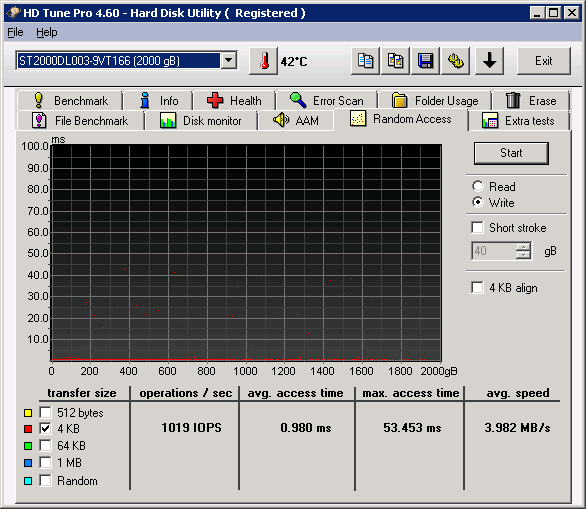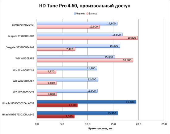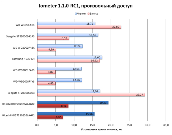 Отсутствие Advanced Format также помогло HDS5C3020ALA632 удержать приемлемое время отклика при произвольной записи. Если же не брать в расчет это ограничение конкурентов, то у диска довольно неповоротливые головки. HDS723020BLA642 также не блещет в сравнении с серией Caviar Black от WD.