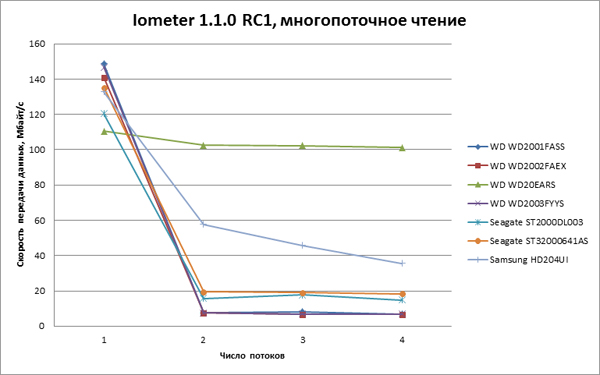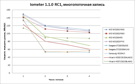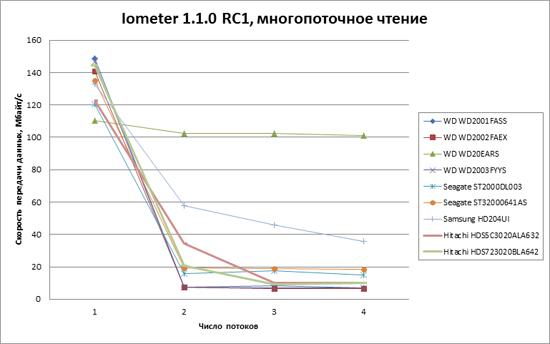 Появление дополнительных потоков при чтении данных существенно снижает производительность дисков Hitachi. Многопоточная запись происходит несколько более эффективно.