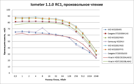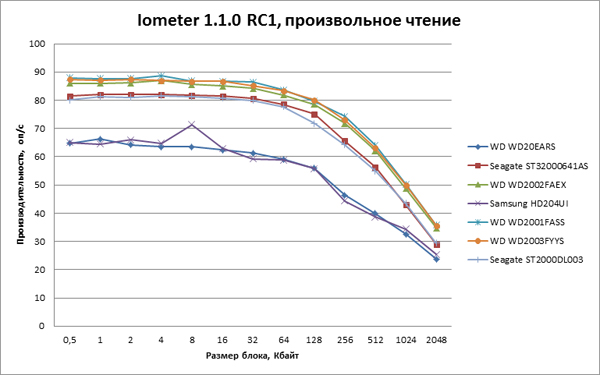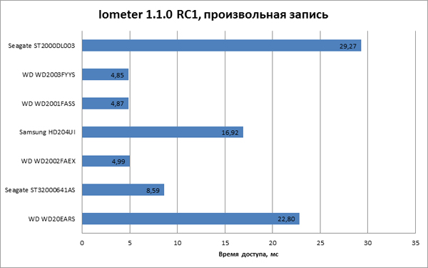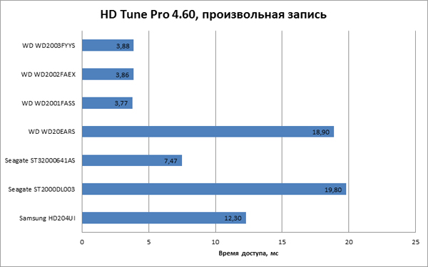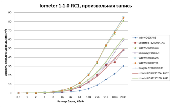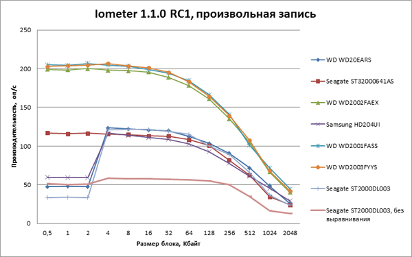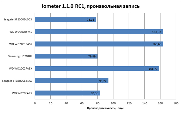 Тест на скорость произвольной записи разделил участников тестирования на две группы, в одну из которых вошли семитысячники от WD, а в другую — все остальные диски. Винчестеры с Advanced Format демонстрируют характерное падение производительности при записи блоков размером меньше 4 Кбайт.