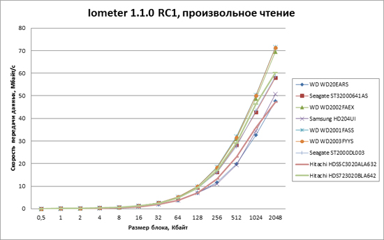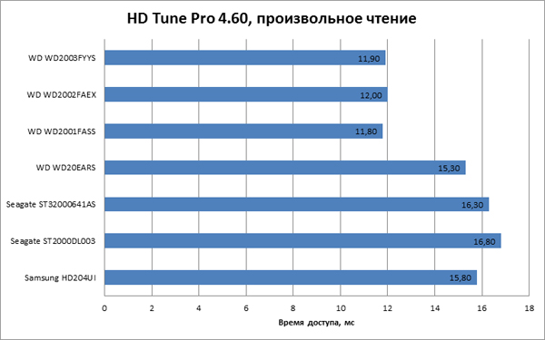 При произвольном доступе ситуация изменилась. Hitachi HDS723020BLA642 читает данные медленнее всех семитысячников, а по скорости записи опережает лишь Seagate ST32000641AS, да и то лишь потому, что привод Seagate оказался столь неудачным.
