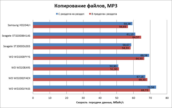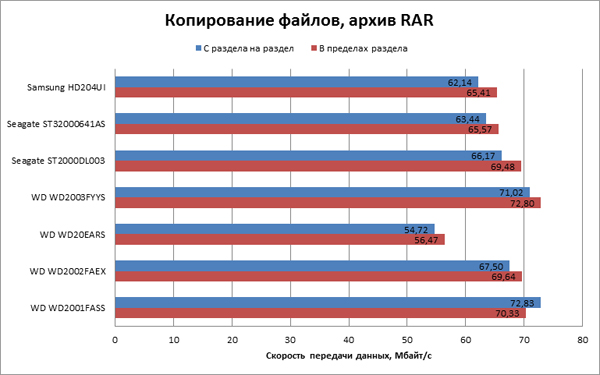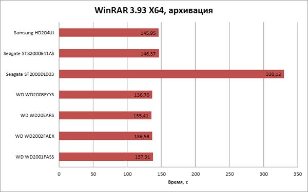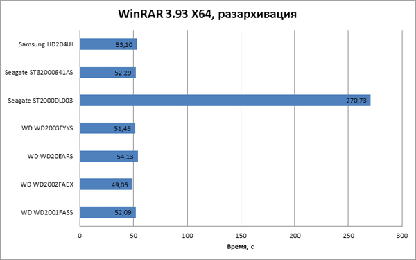 Результаты тестов с использованием архиватора WinRAR в большей степени зависят от производительности CPU, чем от скорости накопителя, поэтому сильные различия между испытуемыми не были выявлены. Разве что, как и в задании на копирование мелких файлов, в обоих тестах (архивация и распаковка) от плотной группы конкурентов безнадежно отстал диск Seagate ST2000DL003.