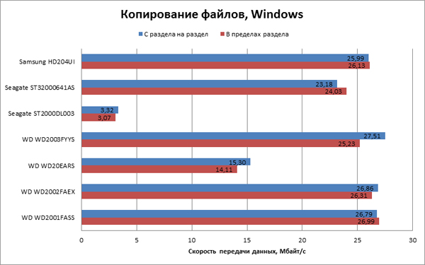 Xорошее впечатление произвел экономичный винчестер Samsung HD204UI из серии EcoGreen F4EG. Этот «зеленый» привод не сильно отстает по производительности от иных семитысячников. И буфер объемом 32 Мбайт ему, похоже, совсем не «жмет». Высокие результаты продемонстрировал и диск Seagate ST2000DL003 из серии Barracuda Green (если закрыть глаза на парадоксально низкую скорость копирования мелких файлов). А вот накопитель ST32000541AS из серии Barracuda XT в большинстве заданий недалеко ушел от своего теоретически более медленного родственника и нередко даже уступал ему первенство.
