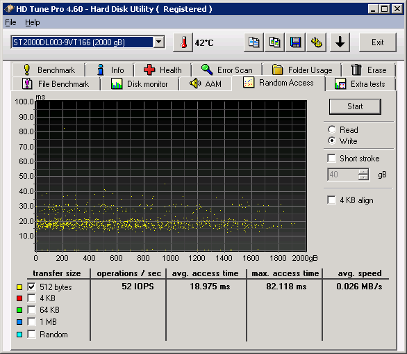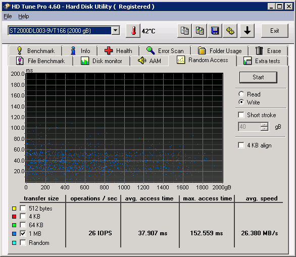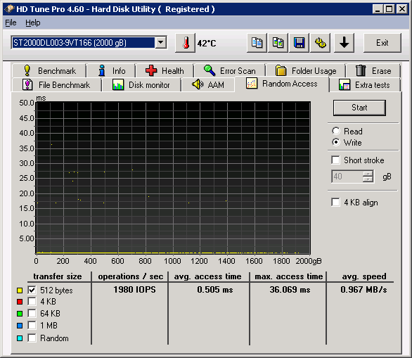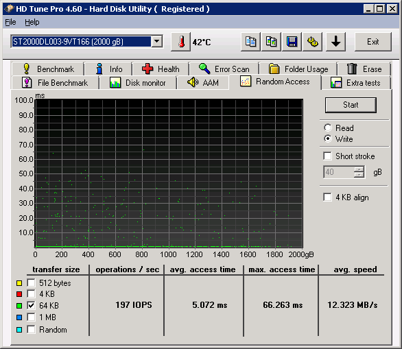 HD Tune также поможет проверить, каким образом на самом деле работает технология Smart Align от Seagate. Посмотрите на скриншоты с результатами тестов произвольной записи: на мелких блоках время доступа неправдоподобно низкое, и «облако» запросов плотно прижалось к нижней границе шкалы. На блоках размером 1 Мбайт эффект уже пропадает.