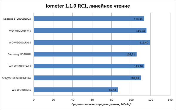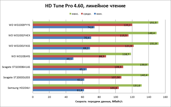 Остальные диски представляют топовые серии десктопных HDD соответствующих производителей. В список испытуемых затесался даже корпоративный привод Western Digital WD2003FYYS. По ТТХ он мало отличается от одного из представителей «черной» линейки WD (WD2001FASS), зато стоит на добрых полторы тысячи рублей больше. За эти деньги пользователь получает гарантию стабильной работы диска в режиме 24/7.