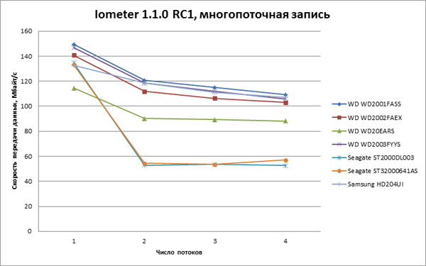 Испытание с многопоточной нагрузкой преподнесло сюрприз: диски WD серий Caviar Black и RE4, которые так ярко «звездили» в предыдущих тестах, провалились на самое дно уже при одновременном чтении двух потоков данных, не говоря о трех или четырех потоках, как и семитысячник от Seagate. А вот WD20EARS, ранее бывший в аутсайдерах, неожиданно оказался на коне. В тесте многопоточной записи первоначальная расстановка сил восстановилась, и, что примечательно, высокий результат в очередной раз показал «зеленый» накопитель Samsung HD204UI.