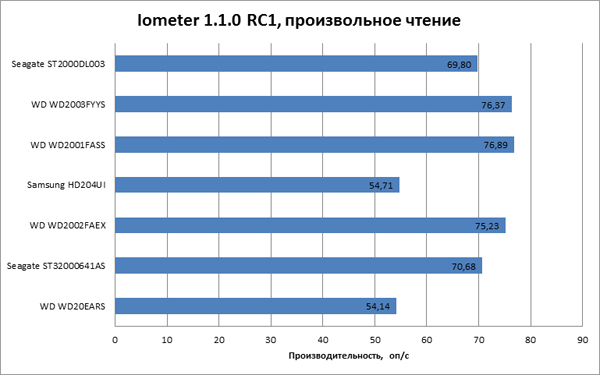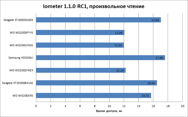 В тесте скорости произвольного чтения снова одержали победу топовые диски WD, а продукты Seagate снова продемонстрировали близкие результаты, несмотря на различающиеся скорости вращения шпинделя. WD20EARS делит последнее место с Samsung H204UI.
