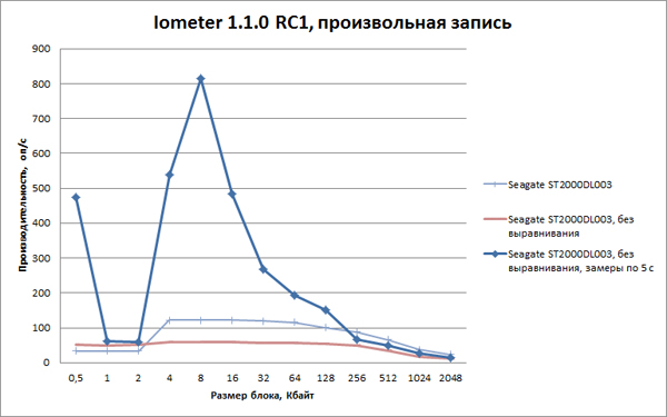Дабы проверить в деле технологию Smart Align винчестера Seagate ST2000DL003, его дополнительно протестировали без выравнивания запросов относительно 4-килобайтной «линейки». Увы, чуда не произошло, и производительность оказалась гораздо ниже, чем при выровненных запросах: очевидно, при сколько-нибудь длительной нагрузке буфер диска быстро заполняется, и отложенная запись уже не дает ожидаемого эффекта. Чтобы все-таки поймать его с помощью Iometer, мы провели еще один тест по специальной программе: запись блоков определенного размера происходила в течение пяти секунд вместо обычных шестидесяти, и после каждого замера накопитель отдыхал в течение минуты. Теперь хорошо заметно, как работает отложенная запись: при столько коротких тестах количество операций в секунду просто зашкаливает.