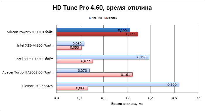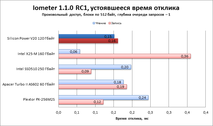 Если же сравнивать время отклика V20 и SSD на других платформах, то этот привод демонстрирует среднюю «отзывчивость», зато без сильного дисбаланса в пользу чтения либо записи данных.