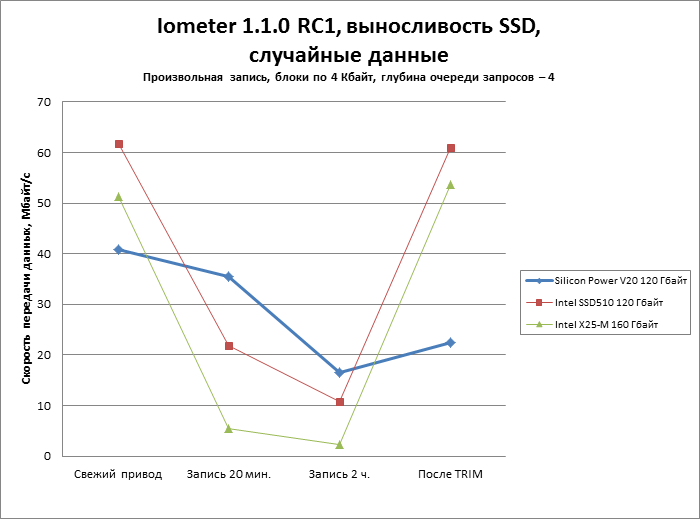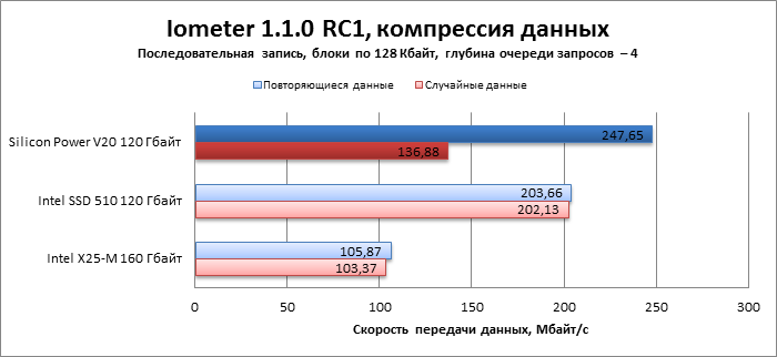Чтобы оценить зависимость накопителей на базе SF-1200 от компрессии, мы измерили скорость записи Silicon Power V20 с использованием случайных данных: она почти в два раза меньше, чем при повторяющихся, легко сжимаемых данных. Дискам с другими чипами, результаты которых приводятся для сравнения, совершенно все равно, что записывать, так как компрессию они не используют.