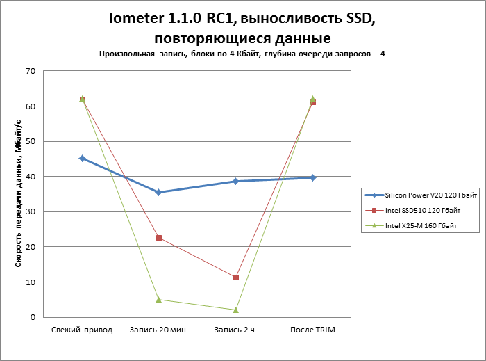 Производительность твердотельного привода падает по мере его заполнения данными. Сохранять форму накопителю помогают компрессия данных и алгоритмы удаления «мусорных» данных. Для оценки эффекта от этих мер мы с помощью Iometer в течение 30 минут бомбардируем накопитель произвольными запросами на запись блоков по 4 Кбайт с глубиной очереди 32. Данные для записи генерируются случайным образом, чтобы затруднить компрессию, которую может выполнять контроллер. Затем процедура продляется еще на полтора часа. У «свежего» накопителя и после обоих циклов заполнения измеряется скорость произвольной записи 4-килобайтных блоков при глубине очереди в 4 запроса, с использованием как повторяющихся, так и случайных данных.