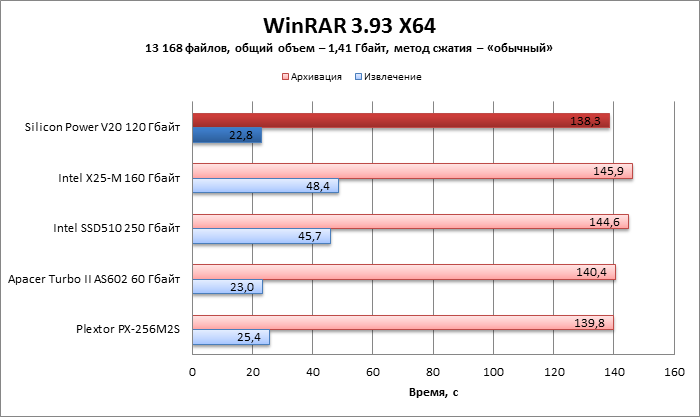 Небольшое преимущество V20 перед моделью Apacer в синтетических бенчмарках вылилось в заметный бонус при копировании файлов в пределах размеченного диска. Скорость работы с файлами различного размера хорошо сбалансирована, и если с крупными и средними файлами быстрее всех управляются Intel SSD 510 и Plextor PX-256M2S, то V20 оказался чемпионом по работе с «мелочью». Распаковка RAR-архива на нем также происходит быстрее всего, хотя превосходство над Apacer тут совершенно мизерное.