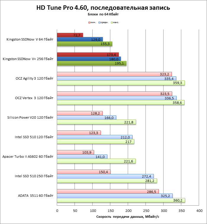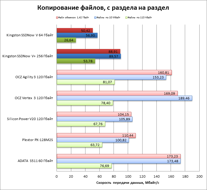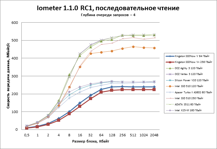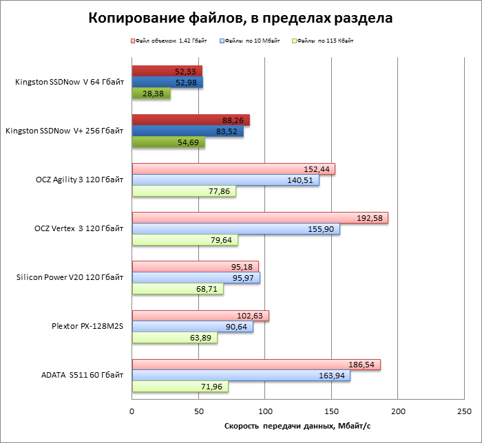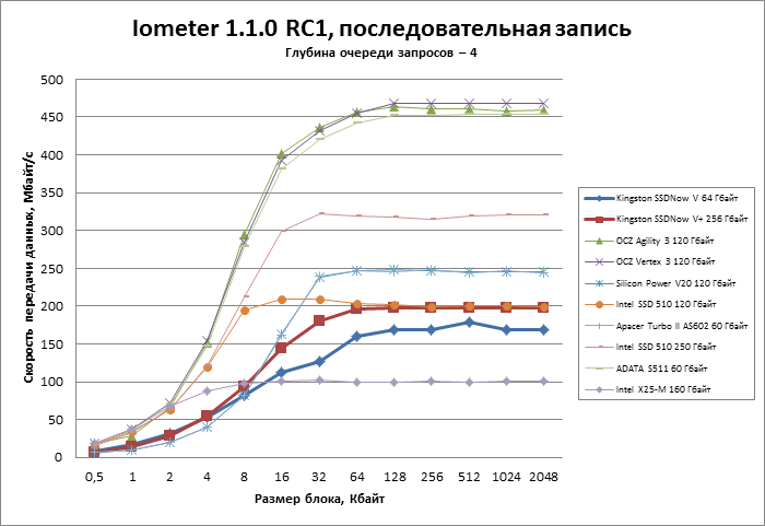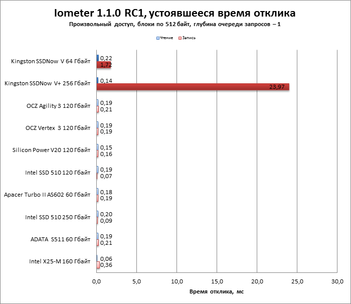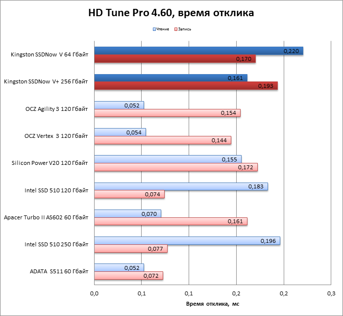 | Kingston SSDNow V+ 256 Гбайт | 0,140954 | 0,119419 | 0,119167 | 0,121985 |
