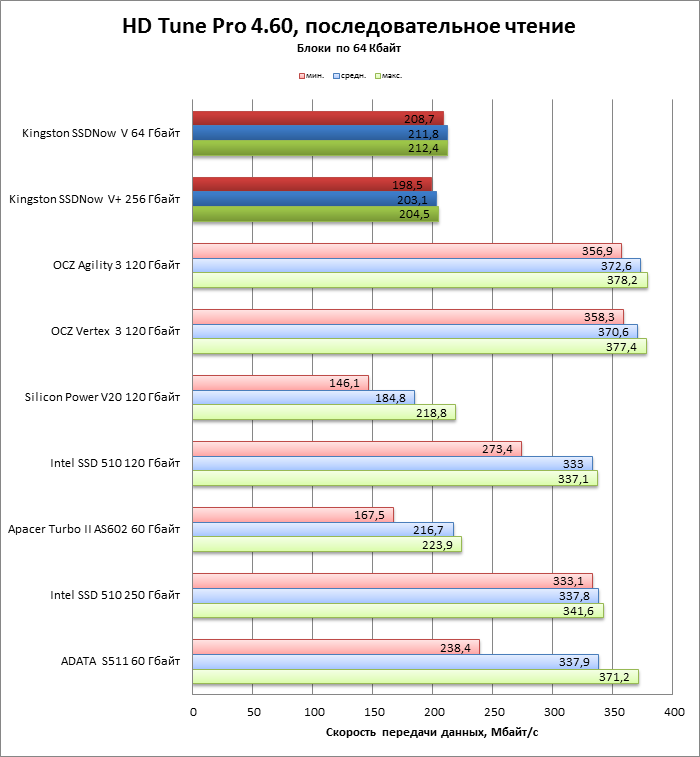 | Kingston SSDNow V 64 Гбайт | 0,428022 | 0,813246 | 3,40922 | 0,6222 |