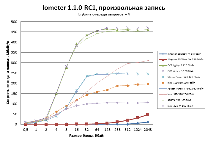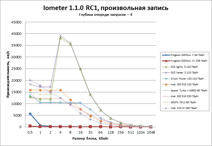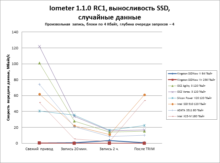 | Iometer 1.1.0 RC1, выносливость SSD, случайные данные Произвольная запись, блоки по 4 Кбайт, глубина очереди запросов — 4 |